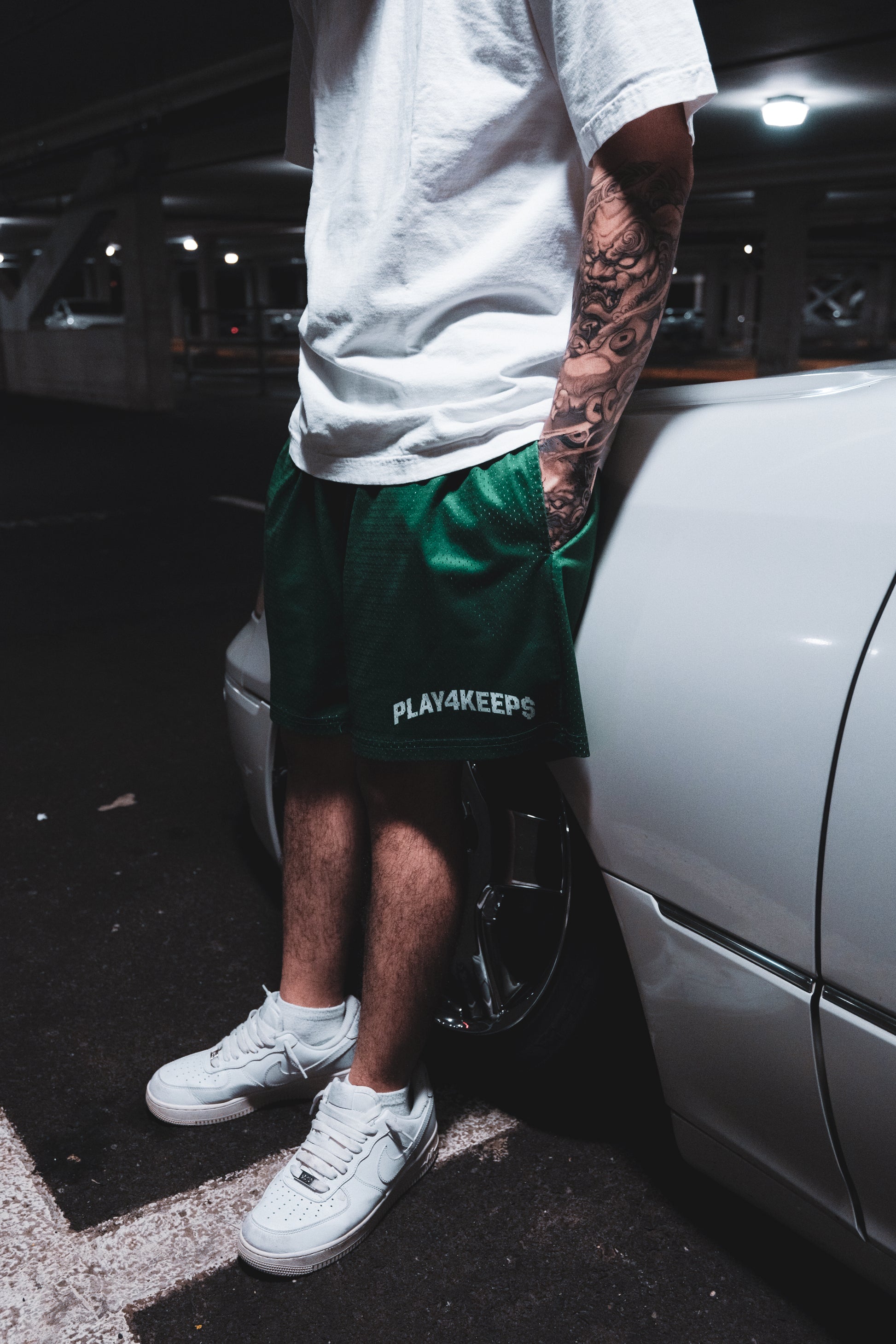 Mesh shorts in Black, Beige, and Green with a white sublimated print design on lower left